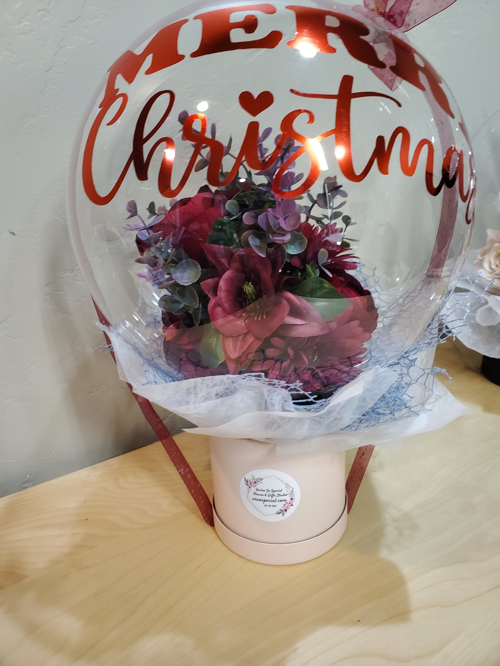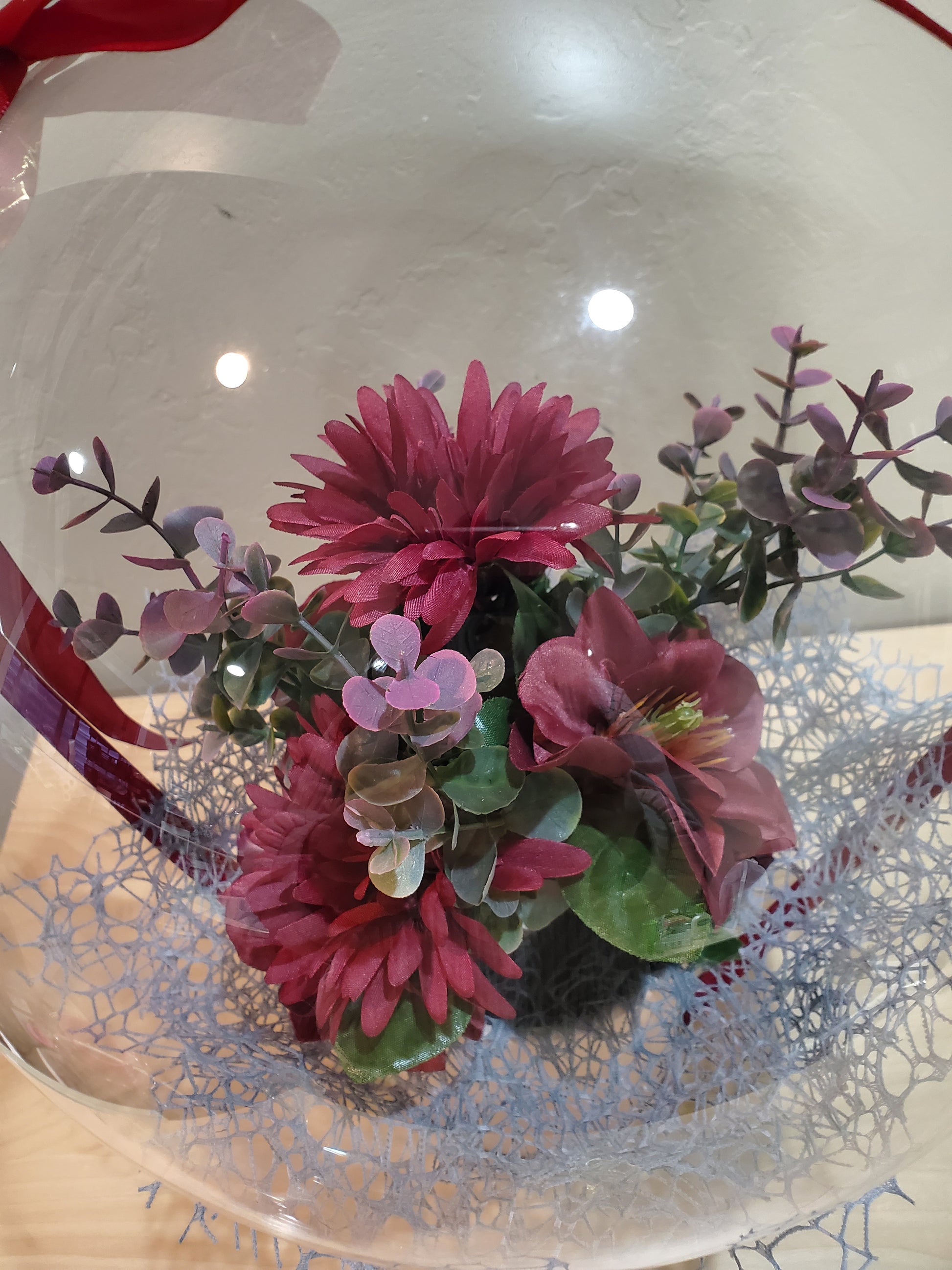 • Ultra Clear Balloon with arranged ARTIFICIAL flowers and succulents