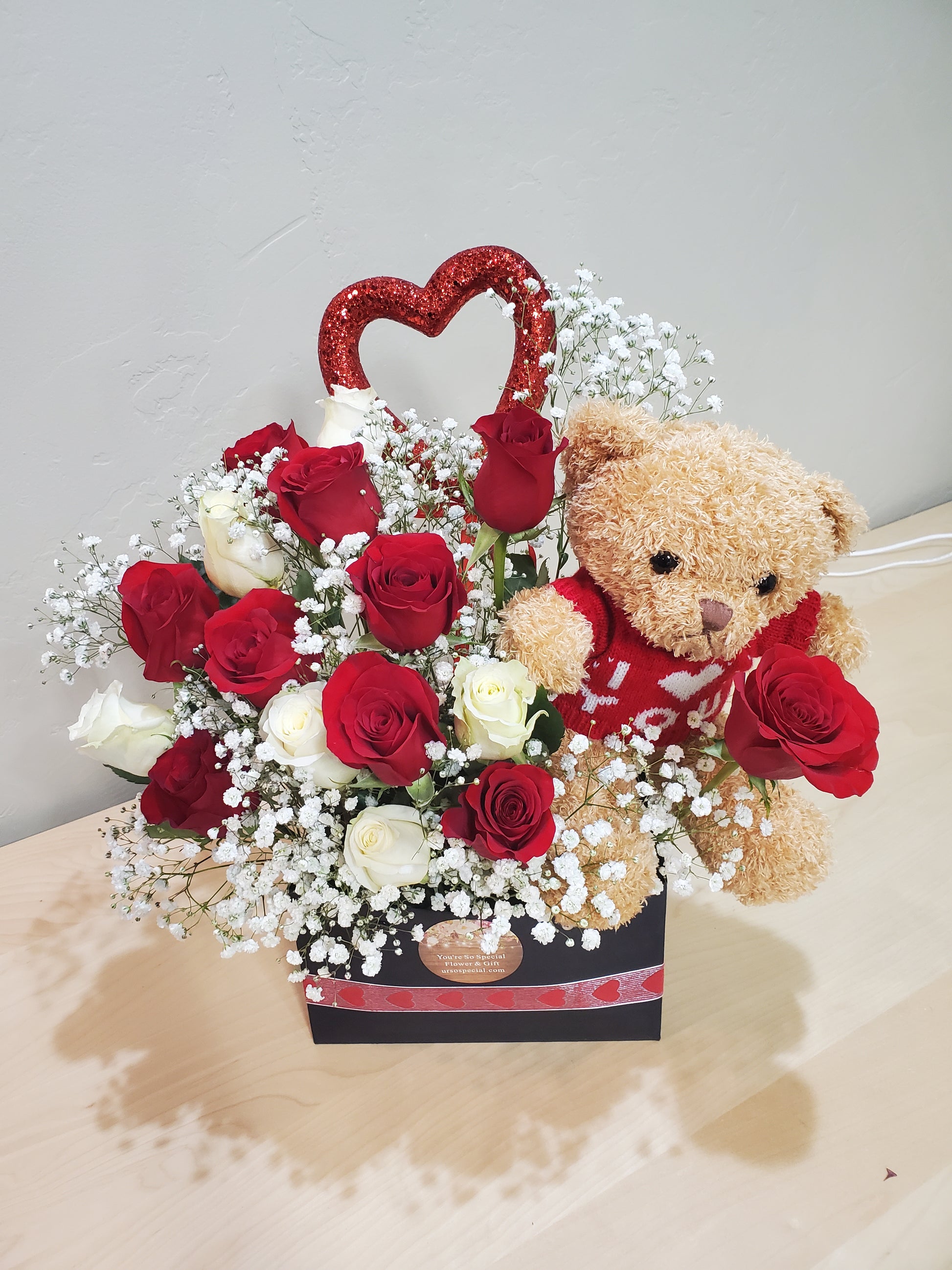 Show them just how much you care with a beautiful rose floral arrangement paired with an adorable "I Love You" teddy bear. A timeless blend of love and affection, the roses convey your heart’s deepest emotions, while the cuddly teddy bear is the perfect companion to remind them of your love, long after the flowers have faded.