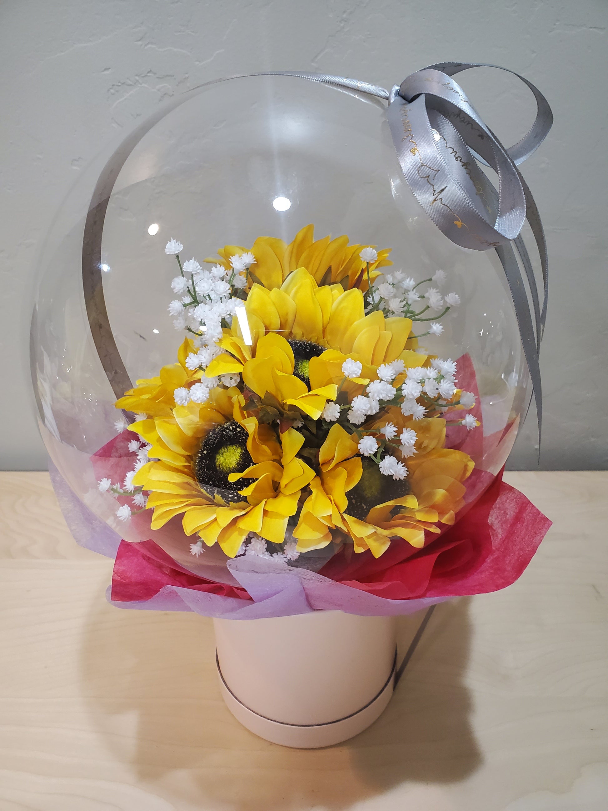 • Ultra Clear Balloon with arranged ARTIFICIAL sunflowers and baby breath.